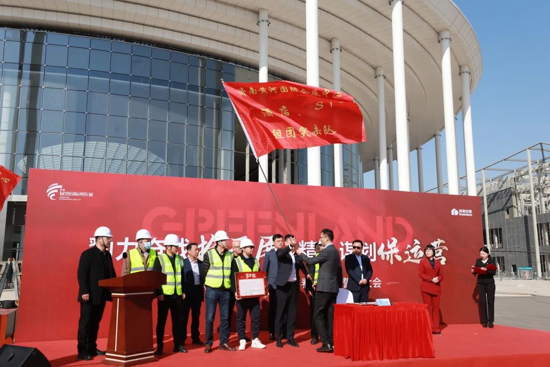 在誓师授旗环节,会展中心“N2-N7、登录厅”组团、“酒店、S1”组团、“N1、S2-S6”组团相关单位负责人分别上台签署军令状,绿地集团山东区域管理总部总经理助理郭浩向各组团授旗。