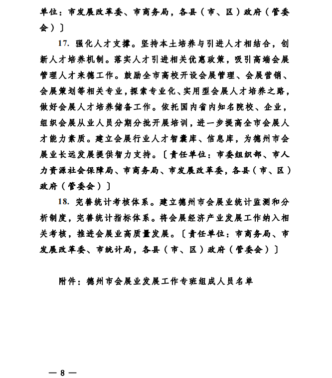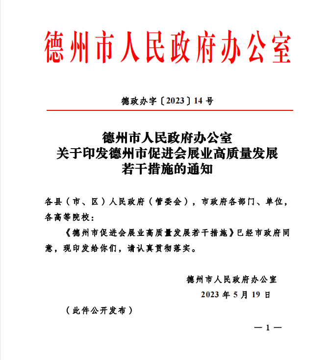 近日,德州市人民政府办公室发布促进会展业高质量发展的18条措施,明确会展业的发展目标和重点任务,成立会展业发展工作专班,以加快会展业高质量发展。