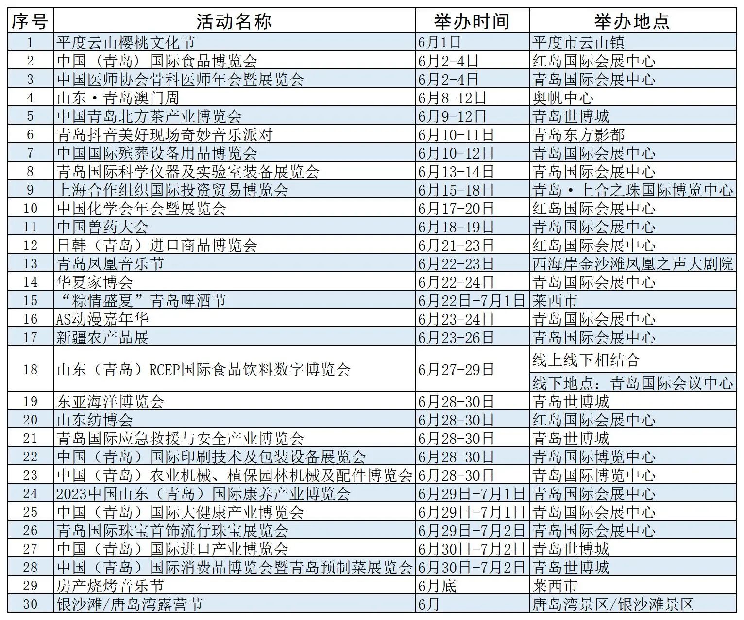 6月份,青岛进入会展活动密集举办期,将有30场规模较大的展会、节庆活动陆续举办,涉及食品、医疗、音乐、动漫、纺织、农业机械、大健康等行业领域,活动数量、规模均恢复至2019年水平。