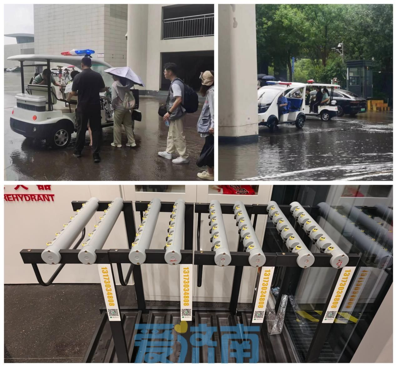 待雨势减弱,会展中心还做了系列“送客”服务工作,让观众和展商们感到暖心。每个展馆内存放的30把雨伞全部开锁供观众使用。在会展中心西门设立了网约车、出租车通道,允许车辆直接开到展厅门口接送观众。看到会展中心广场上存在积水,会展中心服务人员临时调来巡逻电瓶车作为摆渡车,优先将特殊群体摆渡出积水路段。