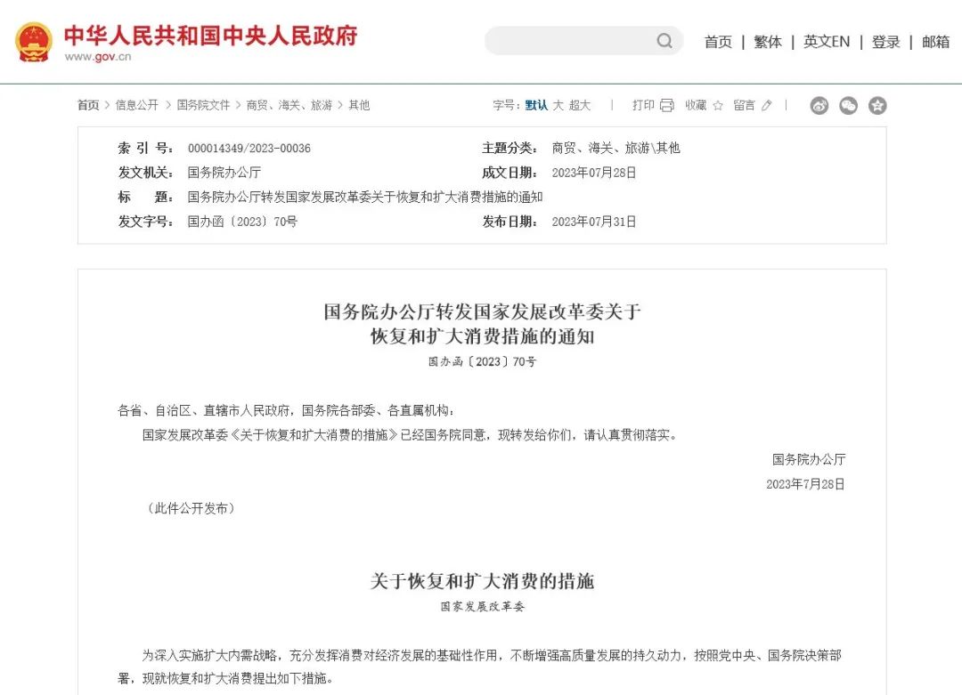 7月31日,国务院办公厅转发《国家发展改革委关于恢复和扩大消费措施的通知》(以下简称《通知》)。《通知》提到,促进文娱体育会展消费。鼓励各地加大对商品展销会、博览会、交易会、购物节、民俗节、品牌展、特色市集等活动的政策支持力度,进一步扩大会展消费。开展“老字号嘉年华”等活动,促进品牌消费。
