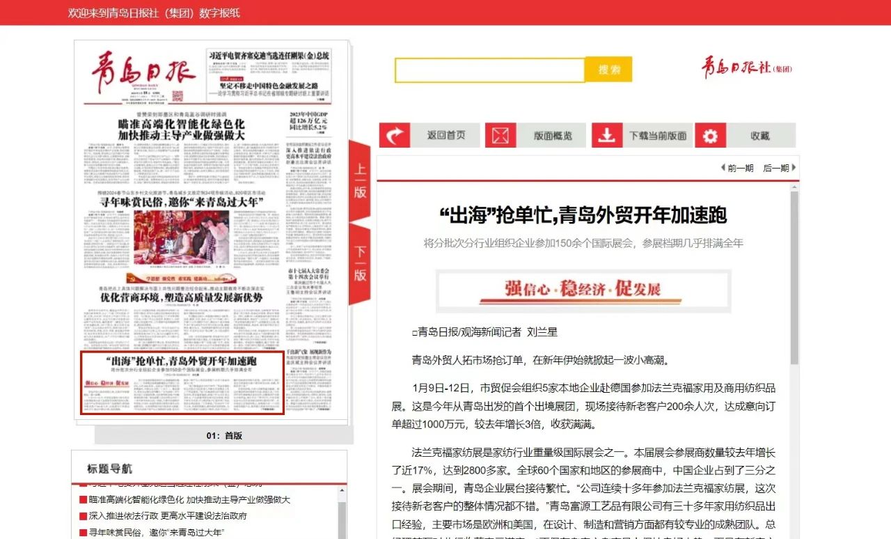 1月9日-12日,青岛市贸促会组织5家本地企业赴德国参加法兰克福家用及商用纺织品展。这是今年从青岛出发的首个出境展团,现场接待新老客户200余人次,达成意向订单超过1000万元,较去年增长3倍,收获满满。