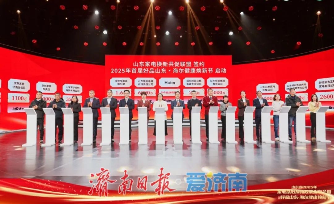 活动中,作为和百姓关系最密切的家电流通企业齐聚一堂,共襄盛举,17家单位签约组建“山东家电换新共促联盟”,共同启动“2025年首届好品山东·海尔健康焕新节”,用好服务搭建起好品山东和消费者之间的桥梁。