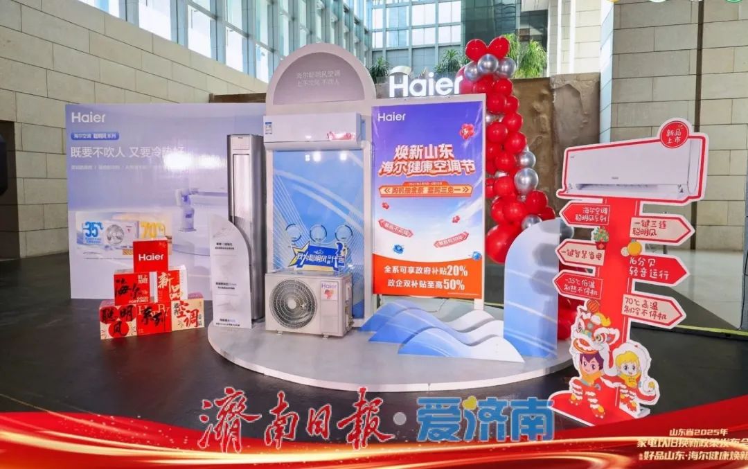 家电以旧换新,好产品是打动消费者的关键所在。活动中,作为好品山东代表企业的海尔发布了聪明风空调新品,直面用户痛点,通过“上下出风不吹人”的技术特色展示了品牌在智能家电领域的创新成果。