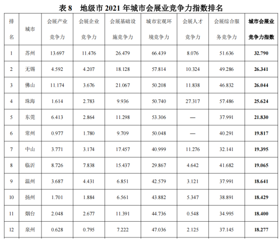 临沂市、烟台市分别在地级市2021年会展业竞争力指数排名中分别位列第八名、第十一名。