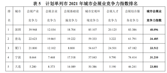 青岛市在计划单列城市2021年会展业竞争力指数排名中位列第二名。