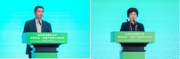 山东省贸促会会长孟向东致辞,他表示山东与东盟国家经贸合作密切、人文交流频繁。前10个月,山东省对东盟进出口增长52.8%,泰国、柬埔寨分别在青岛和济南设立总领事馆,为双方深化合作打下坚实基础。就深化山东-东盟经贸机构的交流与合作,他提出三点建议,一是拓展经贸合作网络,与东盟各国贸促机构、工商团体、商协会组织、华人社团建立更广泛的联系渠道;二是搭建产业合作平台,推动相关产业协同发展;三是组织双向贸易推广活动。