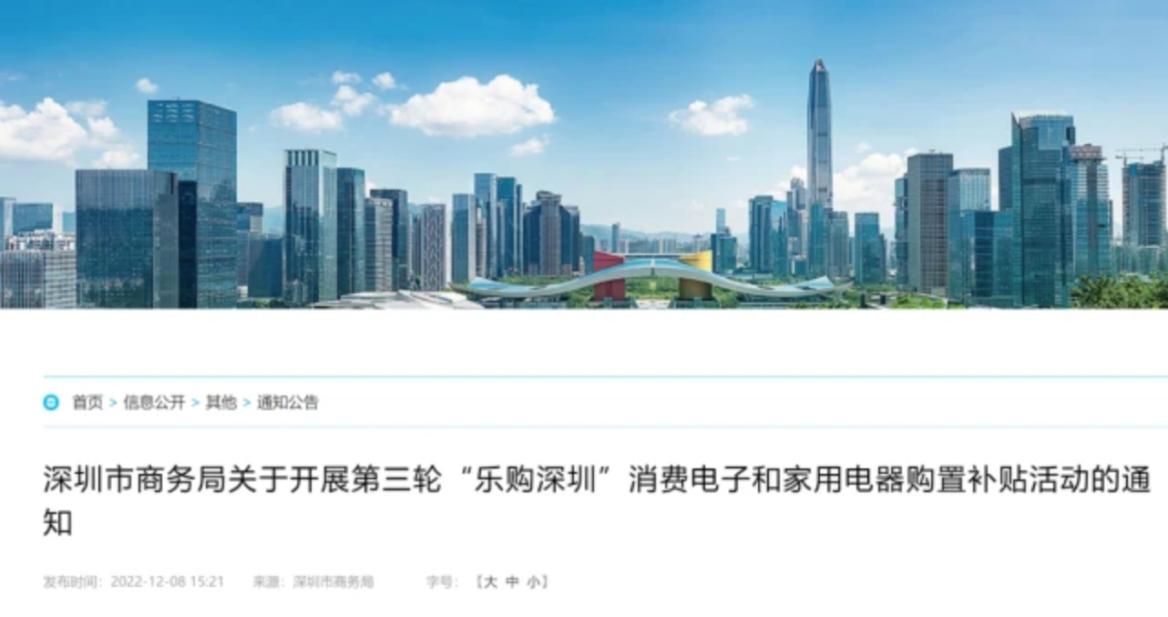 记者在深圳市商务局官网看到,为支持消费者购买消费电子和家用电器产品,根据《深圳市商务局关于发布<“乐购深圳”消费电子和家用电器购置补贴使用指引>的通知》,深圳市商务局将于2022年12月9日启动第三轮“乐购深圳”消费电子和家用电器购置补贴活动。