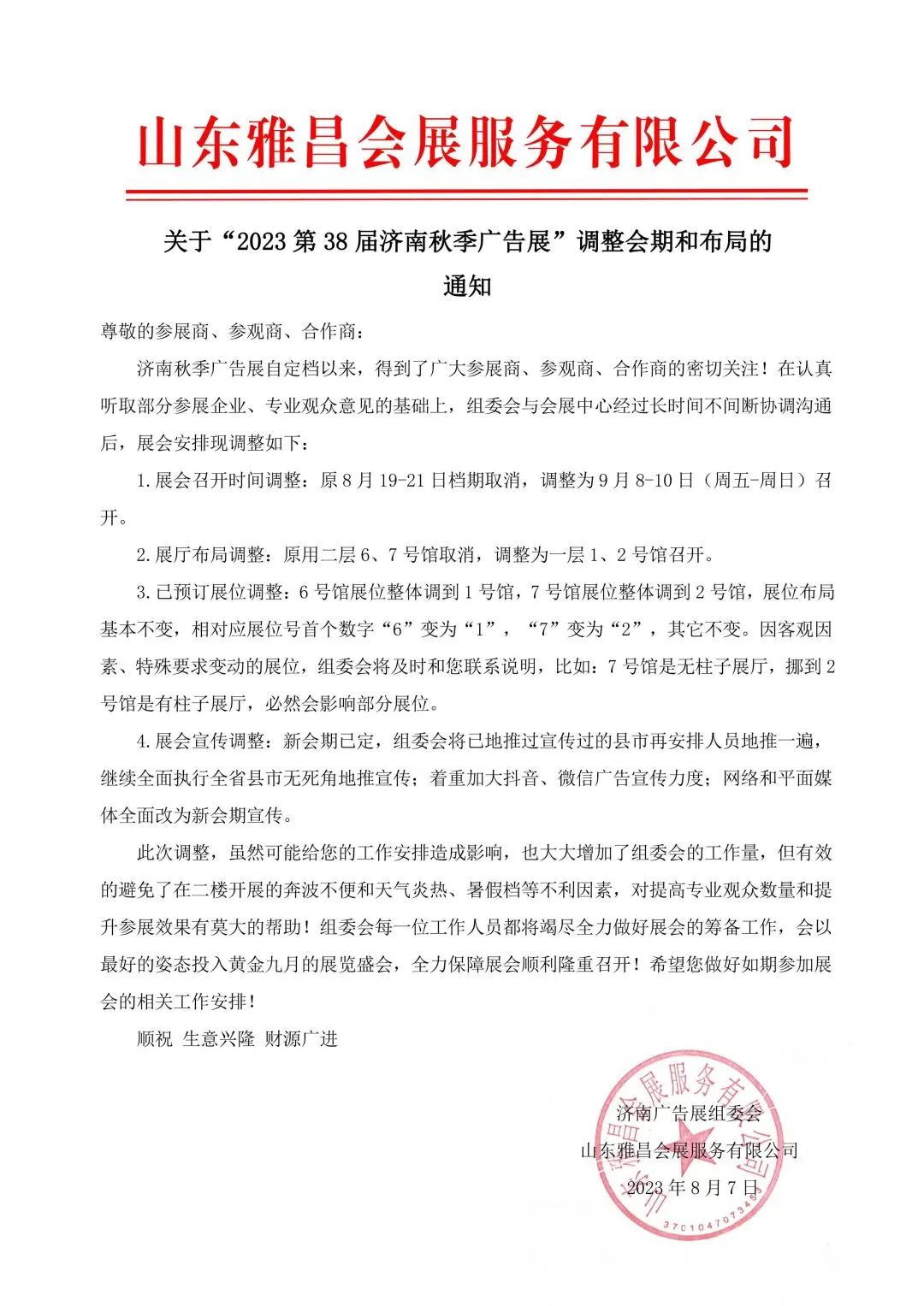 2023济南秋季广告展调整会期和布局 2023-08-08 09:11:20 本站 网络 873 上一篇 2022年中东(迪拜)国际汽车零部件及售后服务展览会超百家中国企业亲临现场 下一篇 【展讯】2023中国(青岛)美容化妆品博览会将于8月10-12日在中铁·青岛世界博览城盛大开幕