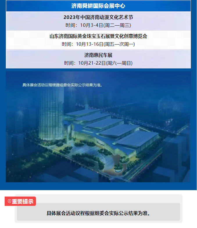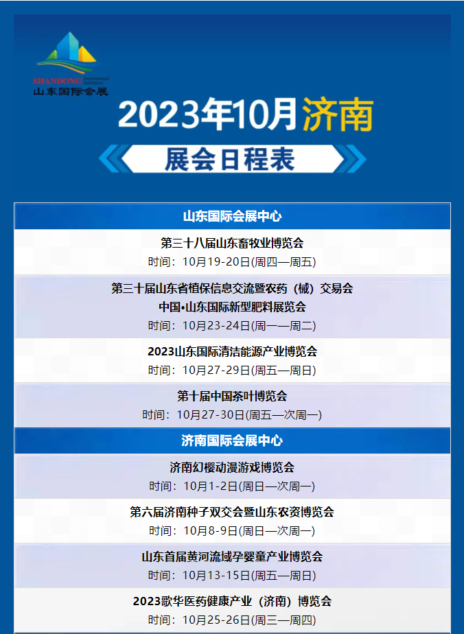 2023年10月济南展会日程表 2023-09-26 09:43:23 本站 网络 846 上一篇 2022年中东(迪拜)国际汽车零部件及售后服务展览会超百家中国企业亲临现场 下一篇 2023山东(青岛)宜居博览会、绿色城市发展大会27日启幕
