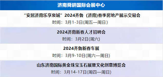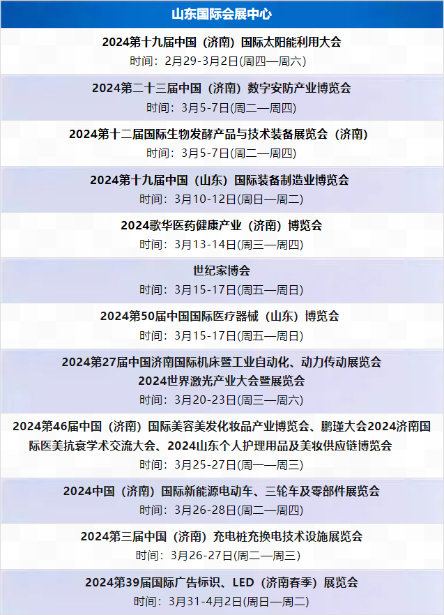 2024年3月济南展会日程表 2024-02-27 09:19:40 本站 网络 572 上一篇 2022年中东(迪拜)国际汽车零部件及售后服务展览会超百家中国企业亲临现场 下一篇 “新十条”助服务业高质量发展 青岛会展业迎发展新契机
