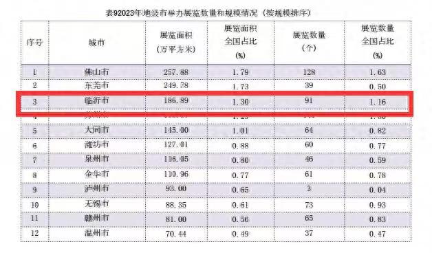 《2023年度中国展览数据统计报告》显示,临沂展览规模居全国地级市第3位