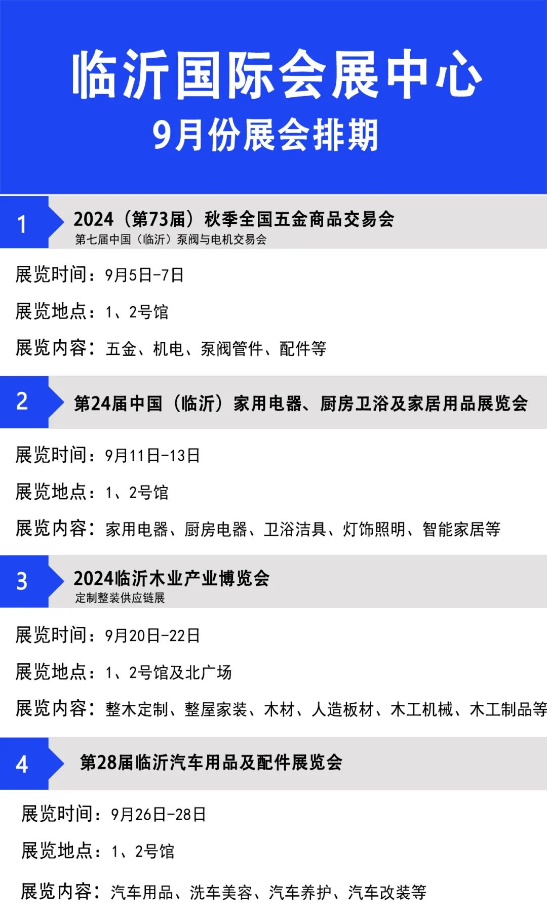 【展会资讯】临沂国际会展中心9月份展会排期 2024-08-27 09:18:32 本站 网络 662 上一篇 2022年中东(迪拜)国际汽车零部件及售后服务展览会超百家中国企业亲临现场 下一篇 511家企业参展,现场及意向交易额3.82亿元 第五届山东体育用……