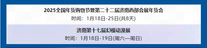 2025年1月山东国际会展中心展会日程表 2024-12-25 09:53:57 本站 网络 625 上一篇 2022年中东(迪拜)国际汽车零部件及售后服务展览会超百家中国企业亲临现场 下一篇 2025济南年货会即将拉开帷幕,2025年1月18-25日在山东国际会展中心举办