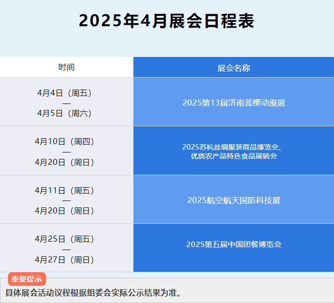 2025年4月济南舜耕国际会展中心排期 2025-04-03 09:23:19 本站 网络 360 上一篇 2022年中东(迪拜)国际汽车零部件及售后服务展览会超百家中国企业亲临现场 下一篇 2025济南国际摩托车博览会将于5月1日-3日在山东国际会展中心举办