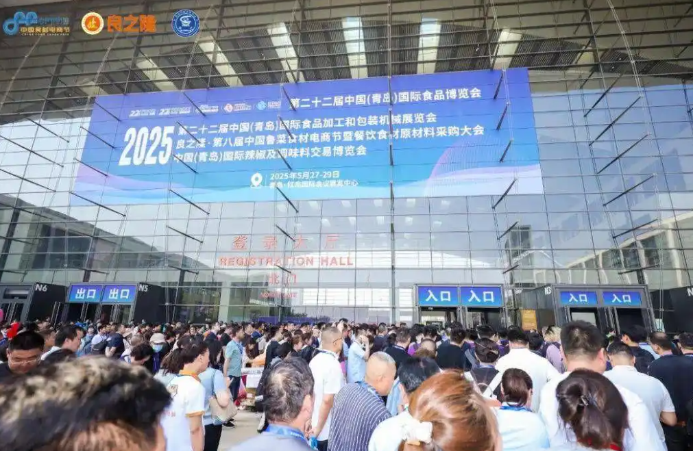 5 月 27 日,良之隆・2025第八届中国鲁菜食材电商节暨餐饮食材原材料采购大会在青岛・红岛国际会议展览中心盛大启幕,同期举办蓝博·2025第22届中国( 青岛)国际食品加工和包装机械展览会、2025中国(青岛)国际辣椒及调味料交易博览会,开启一年一度的鲁菜风味创新和产业协同发展的盛会。本届展会有1000多家家各类食材、辣椒及加工品和食材加工餐厨设备展商参展,规模突破 10万平方米,当天吸引了来自山东十六地市及周边省份万余位专业观众到场参观采购,为山东食餐产业蓬勃发展注入强劲动力。