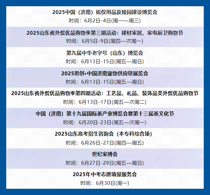 2025年6月山东国际会展中心展会日程表 2025-06-03 09:28:19 本站 网络 219 上一篇 2022年中东(迪拜)国际汽车零部件及售后服务展览会超百家中国企业亲临现场 下一篇 2025国际青年大会开幕,淄博友城40年“大放异彩”!